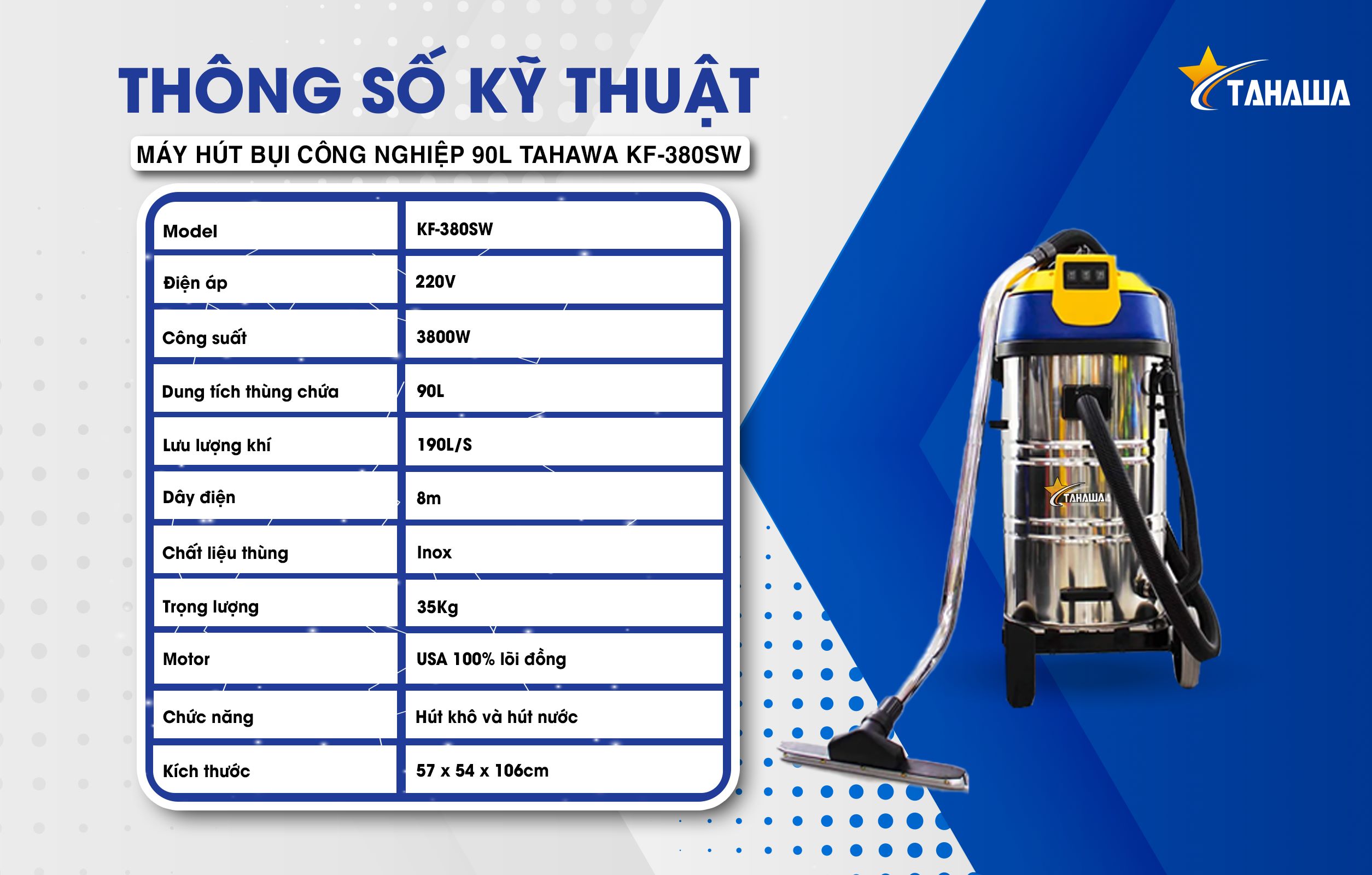 Nếu bạn đang tìm kiếm một chiếc máy hút bụi công nghiệp, Tahawa KF380SW là một lựa chọn tuyệt vời. Với công suất 3800W và lưu lượng khí 190L/S, máy có thể hút sạch bụi bẩn một cách nhanh chóng và hiệu quả. Đặc biệt, máy có thể hút cả khô lẫn ướt, nên bạn không cần phải lo lắng về việc sử dụng máy trong những ngày mưa hay khi vệ sinh sàn nhà. Với dung tích thùng chứa 90 Lít ( 90L ), bạn không cần phải thường xuyên thay thế túi lọc, tiết kiệm thời gian và công sức của bạn.