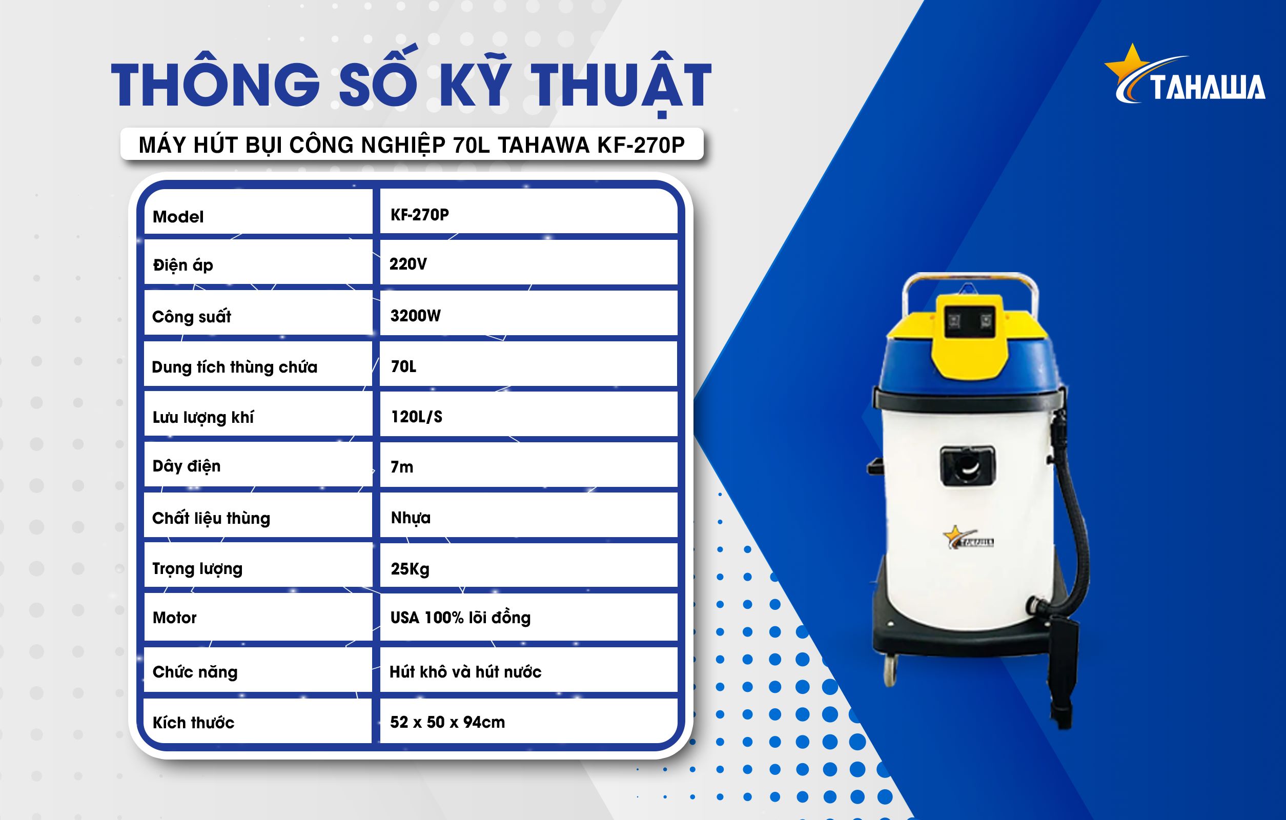Nếu bạn đang tìm kiếm một chiếc máy hút bụi công nghiệp, Tahawa KF270P là một lựa chọn tuyệt vời. Với công suất 3200W và lưu lượng khí 120L/S, máy có thể hút sạch bụi bẩn một cách nhanh chóng và hiệu quả. Đặc biệt, máy có thể hút cả khô lẫn ướt, nên bạn không cần phải lo lắng về việc sử dụng máy trong những ngày mưa hay khi vệ sinh sàn nhà. Với dung tích thùng chứa 70 Lít (70L), bạn không cần phải thường xuyên thay thế túi lọc, tiết kiệm thời gian và công sức của bạn.