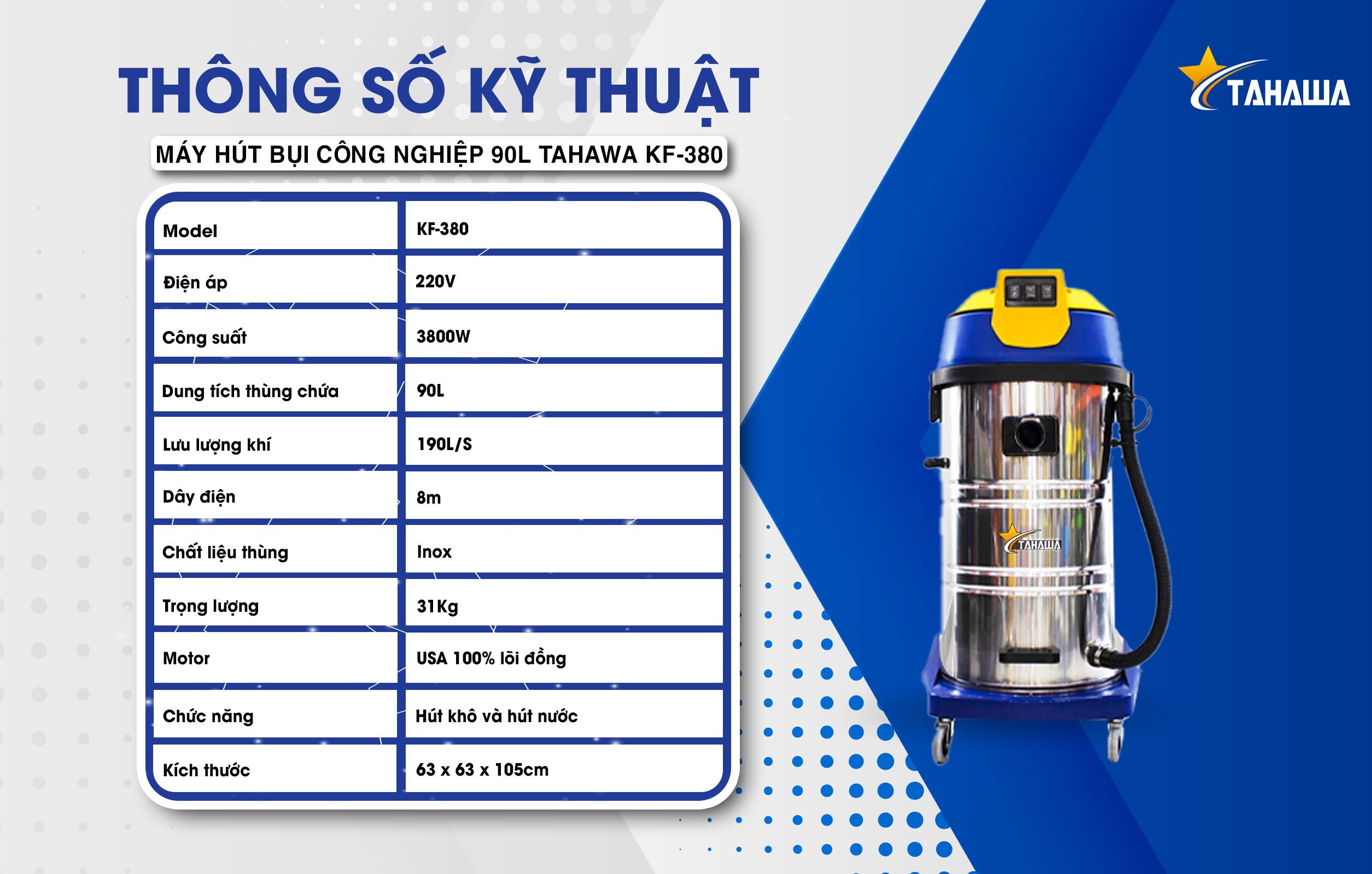 Máy hút bụi Tahawa KF380 được thiết kế dung tích lớn, có bánh xe dễ dàng di chuyển và sử dụng. Bạn có thể sử dụng máy để hút bụi nhà xưởng, hút các mảnh vụn trong kho, văn phòng diện tích rộng, và cả những bụi bẩn công nghiệp. Máy hút bụi Tahawa KF380 sử dụng motor có lõi đồng 100% của USA, đảm bảo sức mạnh và độ bền của sản phẩm.