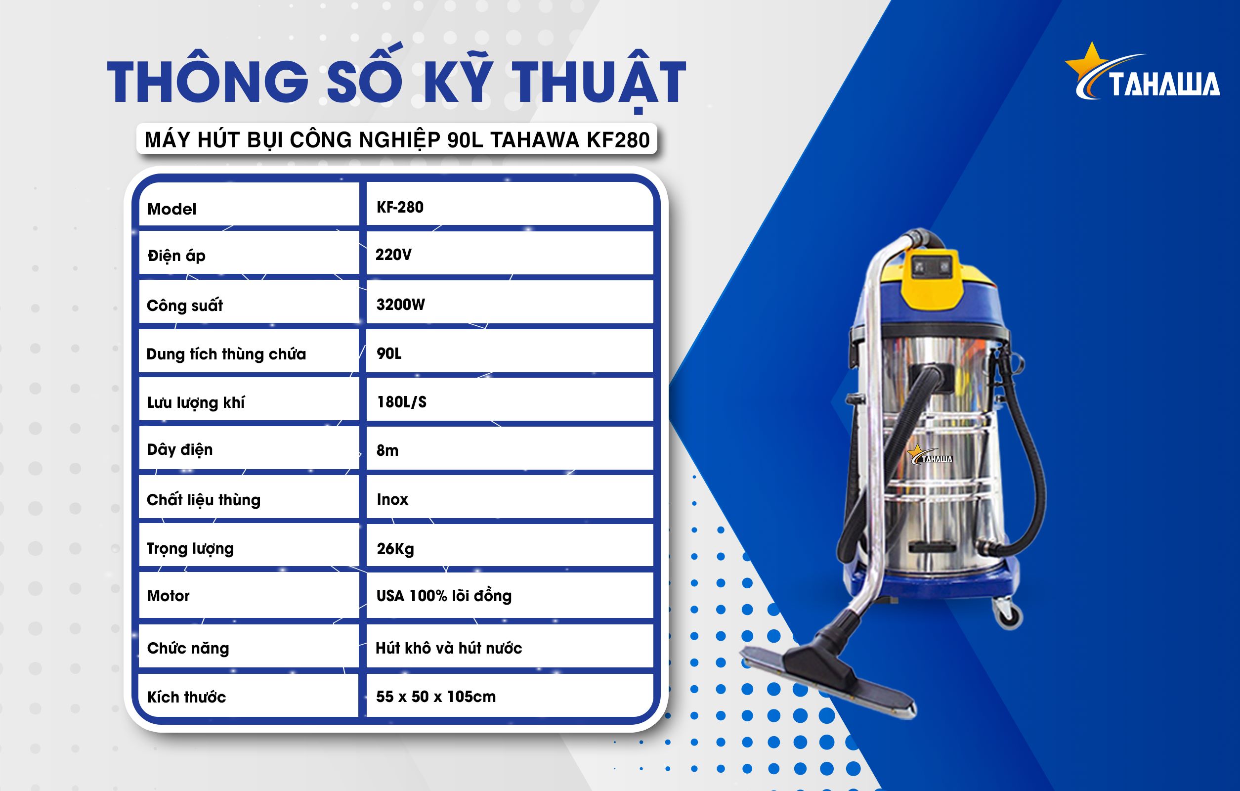 Nếu bạn đang tìm kiếm một chiếc máy hút bụi công nghiệp, Tahawa KF280 là một lựa chọn tuyệt vời. Với công suất 3200W và lưu lượng khí 180L/S, máy có thể hút sạch bụi bẩn một cách nhanh chóng và hiệu quả. Đặc biệt, máy có thể hút cả khô lẫn ướt, nên bạn không cần phải lo lắng về việc sử dụng máy trong những ngày mưa hay khi vệ sinh sàn nhà. Với dung tích thùng chứa 90 Lít ( 90L ), bạn không cần phải thường xuyên thay thế túi lọc, tiết kiệm thời gian và công sức của bạn.