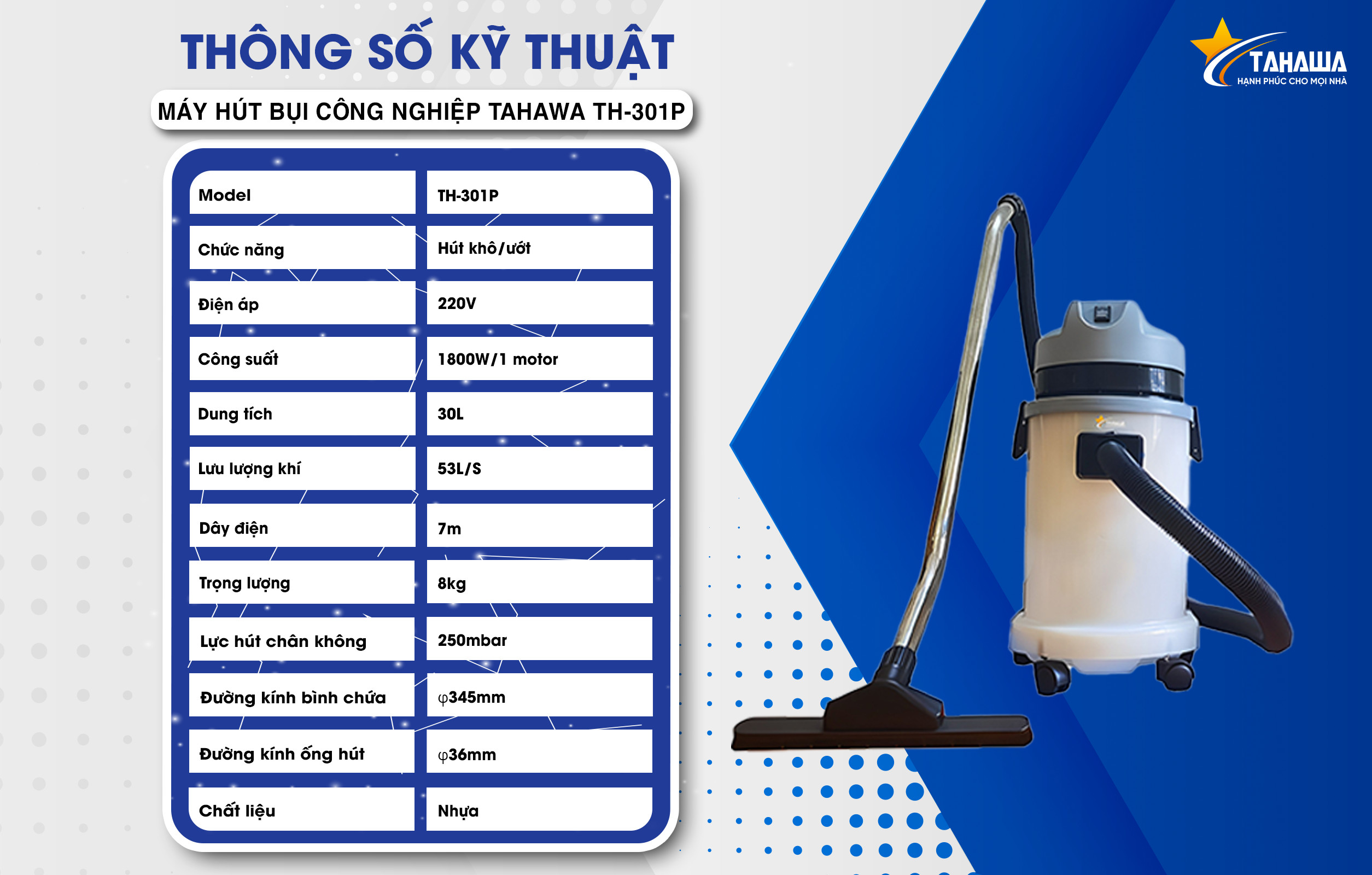 Máy hút bụi công nghiệp Tahawa TH-301P là chiếc máy hút bụi nhà xưởng có thùng chứa bụi bẩn, rác thải dung tích 30 lít. Dung tích thùng chứa này đáp ứng được nhu cầu tại những không gian vừa và nhỏ.