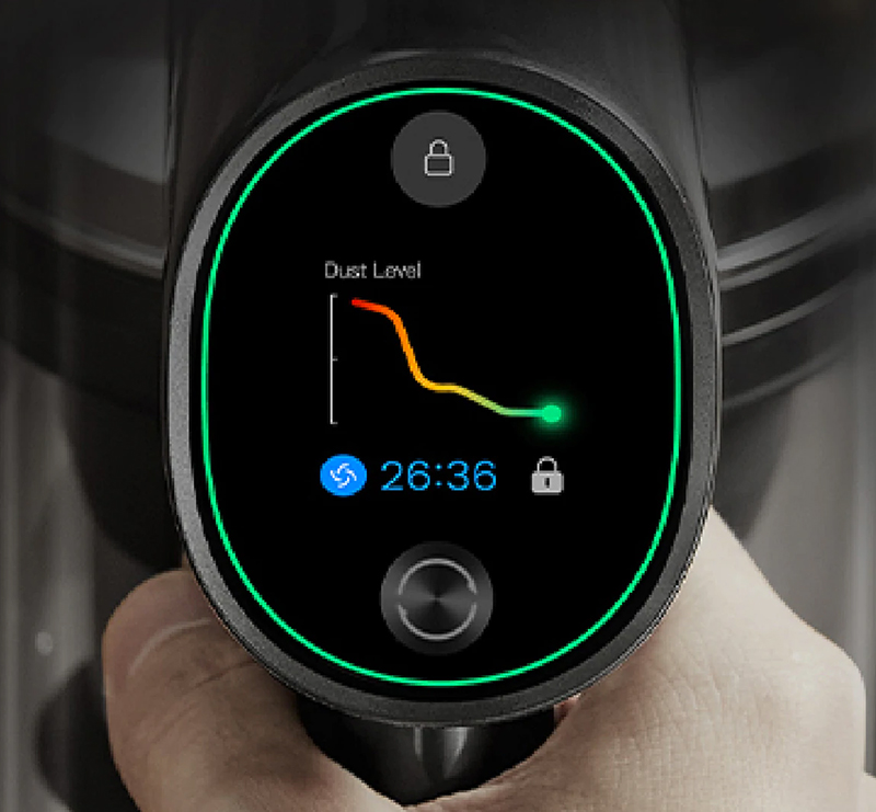 Dreame T30 có màn hình HD thông minh để bạn có thể theo dõi hoạt động của thiết bị. Thông tin như dữ liệu làm sạch, chế độ hoạt động hiện tại hoặc công suất hút, được hiển thị trên màn hình. Hơn nữa, thiết bị kiểm tra mức độ bụi, vì vậy bạn có thể kiểm soát hiệu quả làm sạch. Thông tin về lượng thời gian còn lại sẽ cho phép bạn lập kế hoạch công việc của mình sao cho hợp lý nhất.
