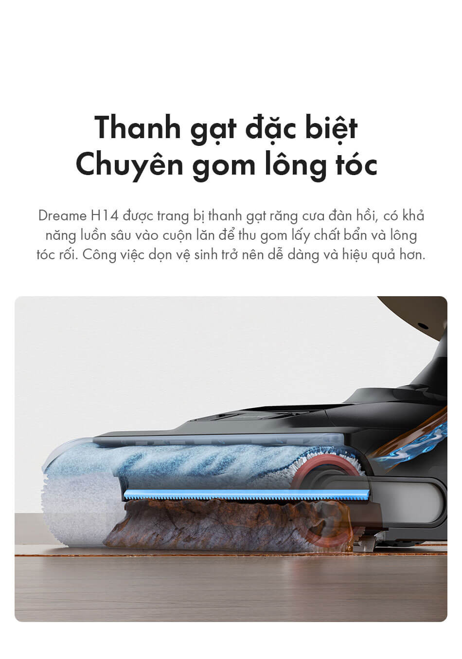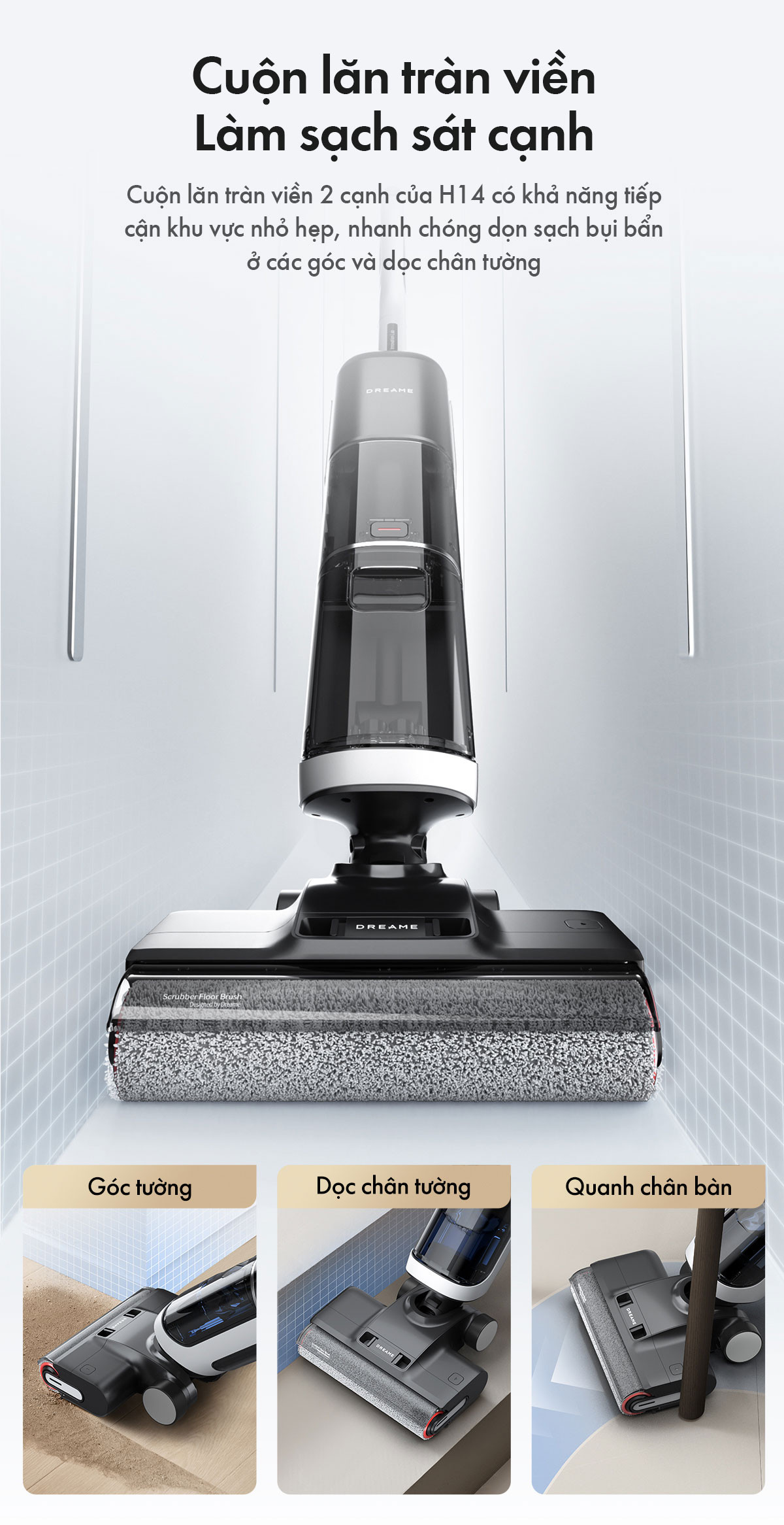 - Dreame H14 có con lăn tràn viền, làm sạch mọi góc cạnh