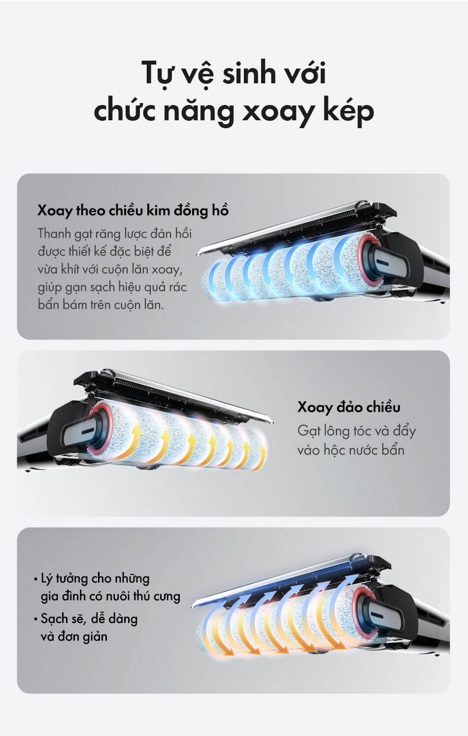 Cuộn lăn xoay kép của H14 mô phỏng chuyển động rửa tay theo 2 chiều, cắt tóc rối và gạn sạch rác.
