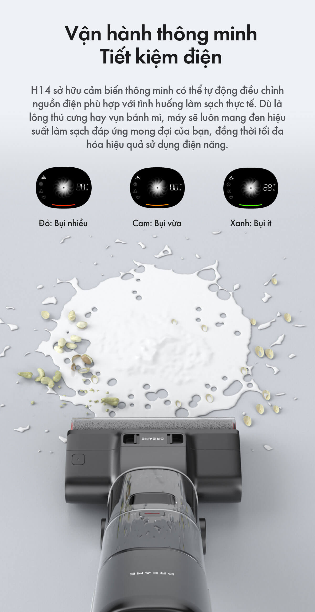 H14 được trang bị cảm biến thông minh có thể tự động điều chỉnh nguồn điện phù hợp với tình trạng bẩn của sàn nhà. Cho dù là lông thú cưng hay mảnh vụn, H14 đều mang lại hiệu suất thỏa đáng đồng thời tối đa hóa hiệu quả sử dụng năng lượng.