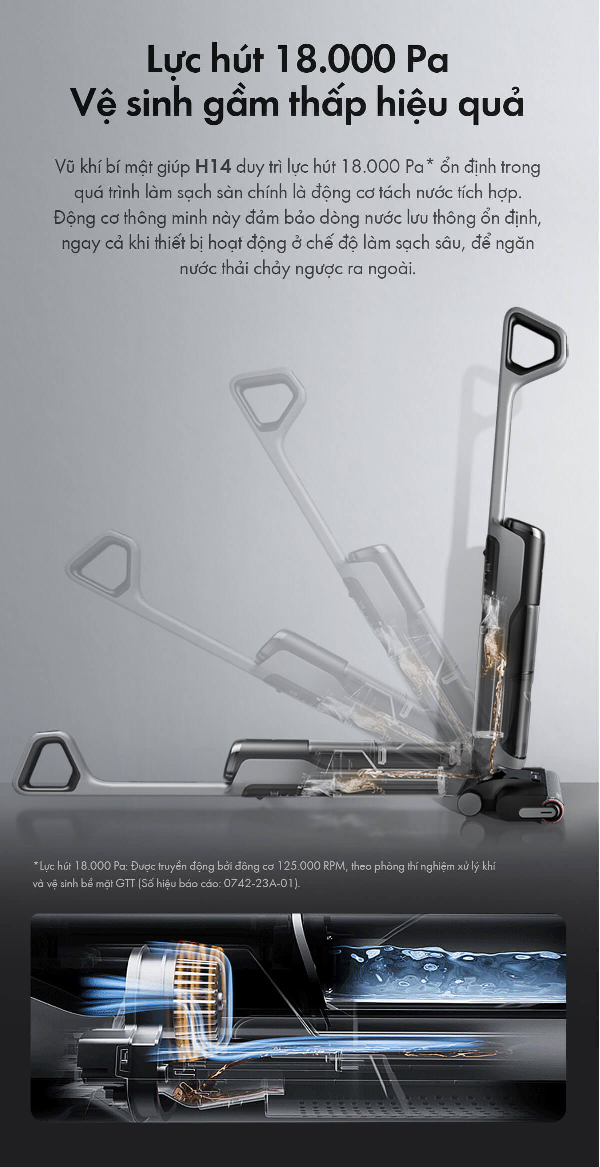 Lực hút mạnh: Được trang bị động cơ 125.000RPM (MỚI), H14 tự hào có lực hút ấn tượng 18.000Pa có thể xử lý nhiều loại vết bẩn khác nhau, ướt hoặc khô.