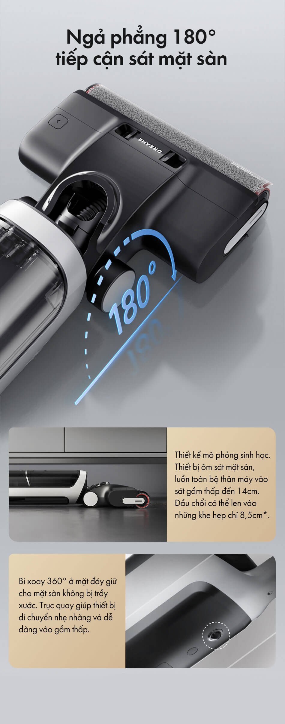 Dreame H14 thiết kế đặc biệt, có thể gập sát mặt sàn 180°, dễ dàng làm sạch các khu vực có chiều cao thấp dưới 14cm. Ngoài ra khớp cầu quay 360° trên thân máy giúp di chuyển dễ dàng và linh hoạt trong không gian hẹp, kết hợp với bánh xe điều hướng ở phía sau, giúp mặt sàn không bị trầy xước.