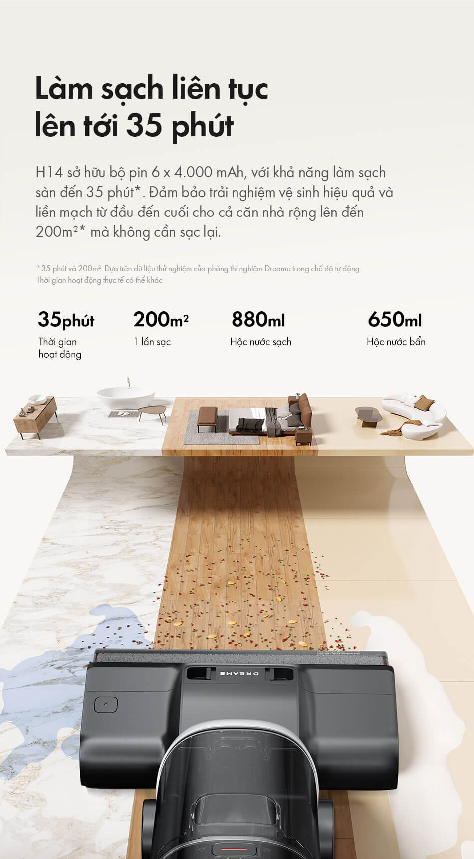 H14 được trang bị bộ pin dung lượng 4.000mAh, cho thời gian chạy 35 phút* ở chế độ lau sàn. Chinh phục những ngôi nhà có diện tích lên tới 260m2 mà không cần sạc lại - trải nghiệm làm sạch mượt mà và hiệu quả từ đầu đến cuối