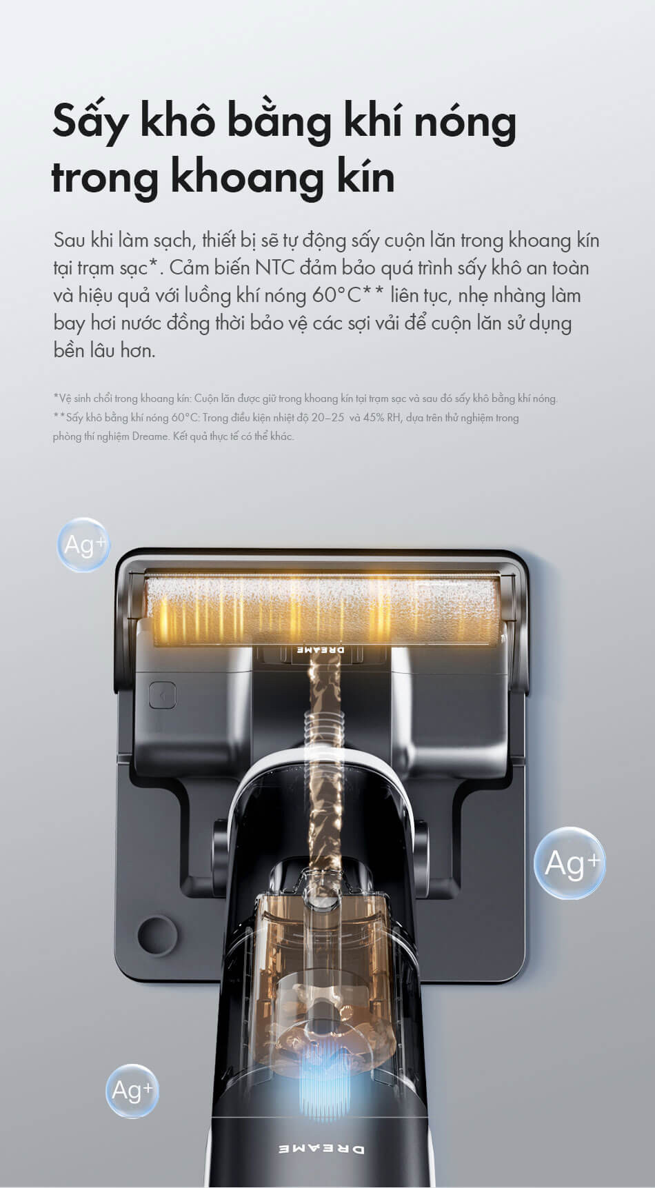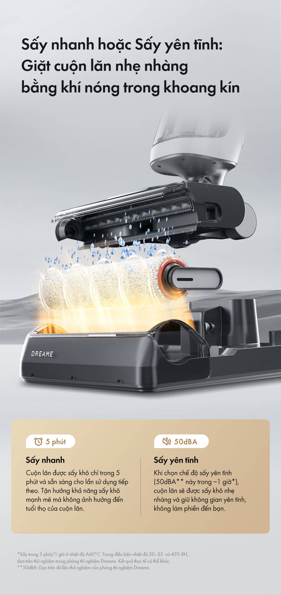 Cuộn lăn sẽ tự động khô sau khi được làm sạch. Cảm biến NTC trên đế đảm bảo sấy khô an toàn và hiệu quả: Không khí nóng liên tục thổi ở 60°C*, nhẹ nhàng loại bỏ độ ẩm đồng thời bảo vệ sợi vải trên cuộn lăn để có độ bền lâu dài hơn.