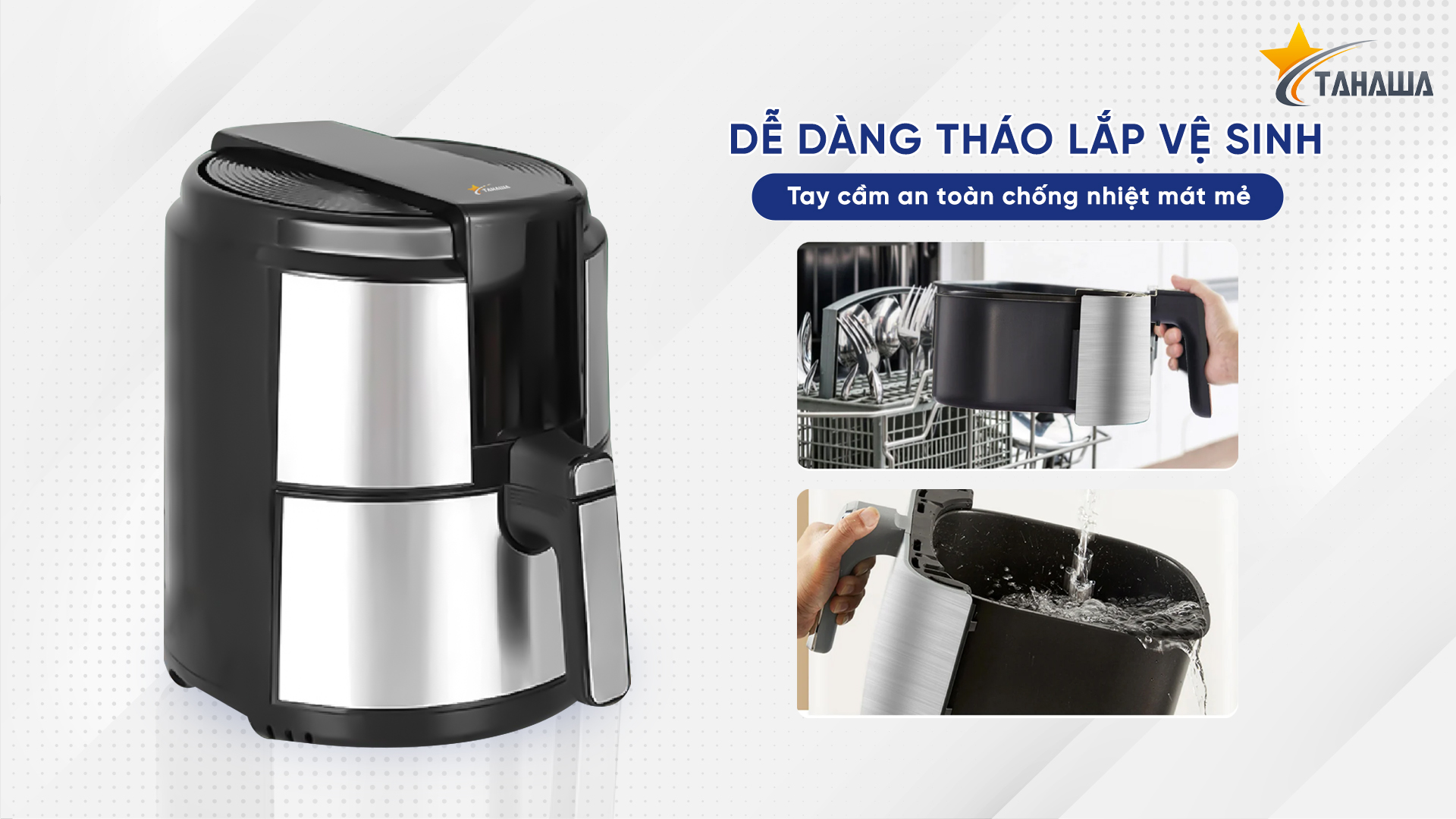 Nồi chiên không dầu Tahawa TH-221 kết cấu chắc chắn, thiết kế gọn đẹp với vỏ bằng nhựa ABS cao cấp cách nhiệt, ít bám bẩn, dễ dàng tháo lắp vệ sinh.