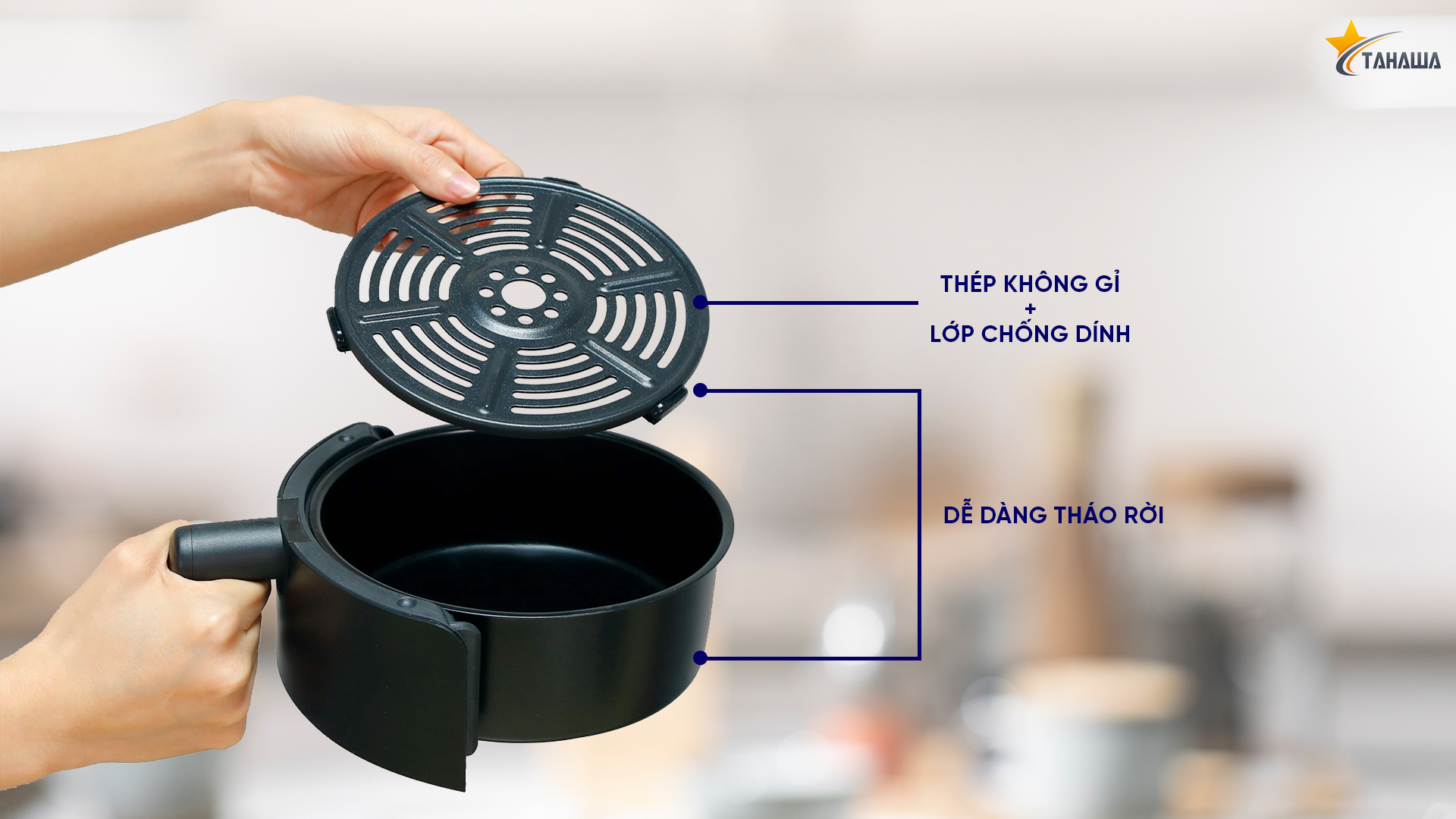 Tay cầm rổ chiên cứng cáp, chắc chắn, bọc nhựa cách điện an toàn cho người sử dụng. Lòng nồi chiên không dầu thép sơn tĩnh điện, phủ chống dính giảm tình trạng dính cháy, chống trầy, dễ làm sạch. Vỉ chiên được làm gọn đẹp, tách dầu mỡ nhanh, tháo rời khỏi rổ chiên dễ dàng, tiện vệ sinh và cất giữ
