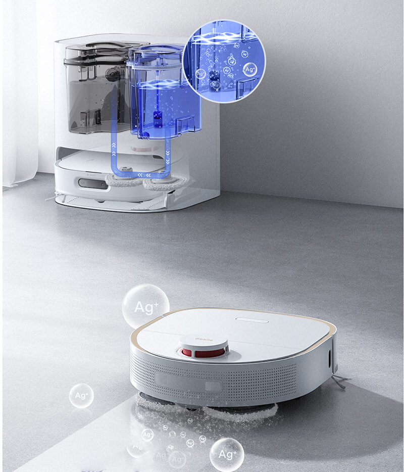 Dreame W10 Pro không chỉ làm sạch mà còn khử trùng và lọc sạch bể chứa nước thải nhờ công nghệ ion bạc. Với khả năng tự động giặt và sấy khô giẻ lau, người dùng không cần can thiệp thủ công.