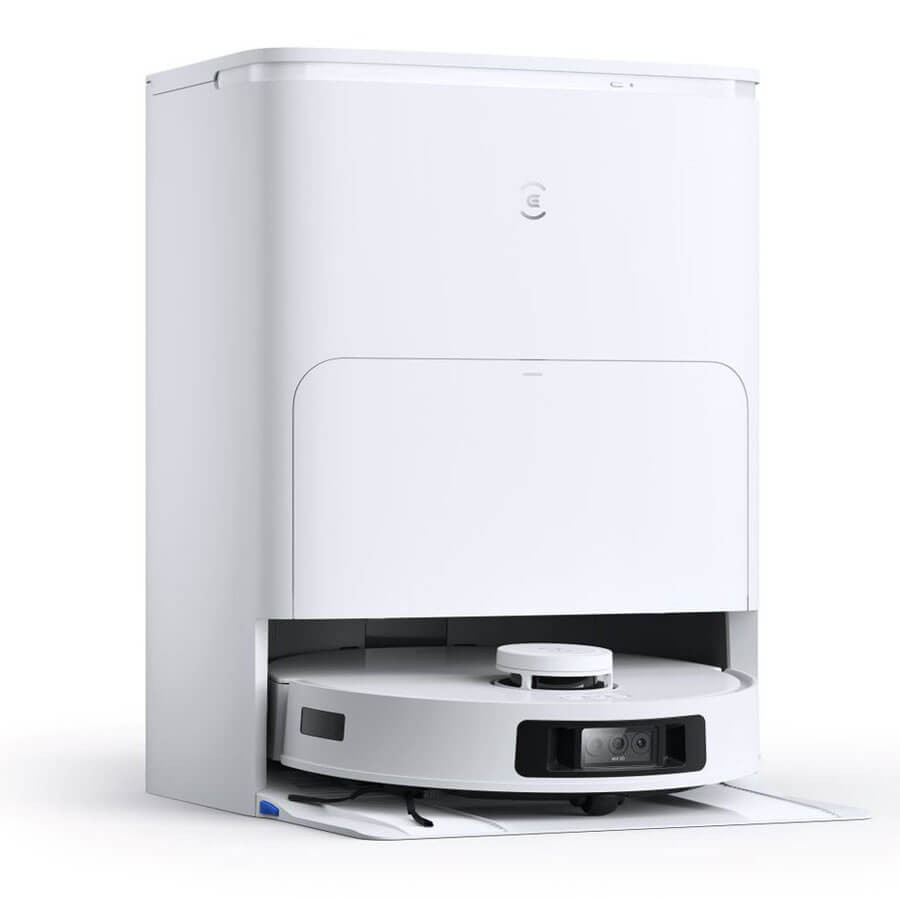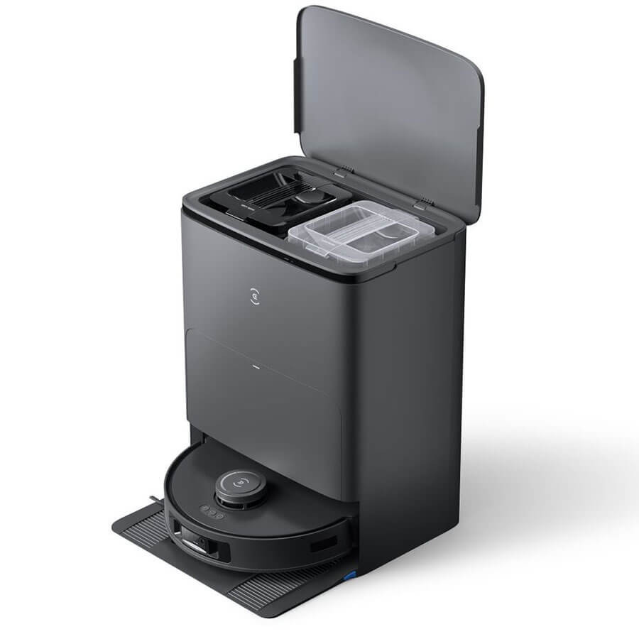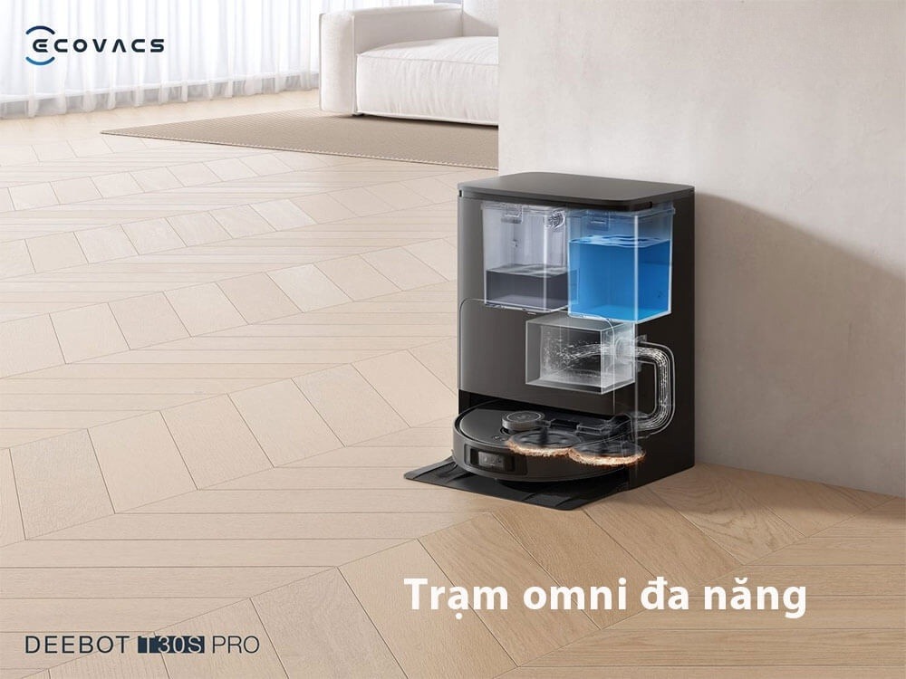 Trạm sạc đa năng tích hợp chức năng giặt giẻ bằng nước nóng 70°C, sấy khô giẻ lau bằng khí nóng 45°C trong 2 tiếng, hút rác tự động lên túi chứa (Túi chứa rác có dung tích 3 lít, có thể chứa được 60 ngày mà không cần đổ rác), cấp nước tự động vào bình chứa của robot giúp giữ ẩm đều khăn lau trong suốt quá trình lau.