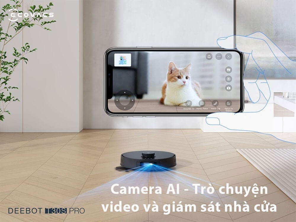 Camera AI không chỉ giúp cho Deebot T30S Pro 2025 nhận diện và tránh vật cản một cách thông minh mà còn hỗ trợ tính năng giao tiếp hai chiều. Người dùng có thể giám sát nhà cửa từ xa, đồng thời có thể giao tiếp với người thân hoặc thú cưng thông qua robot.