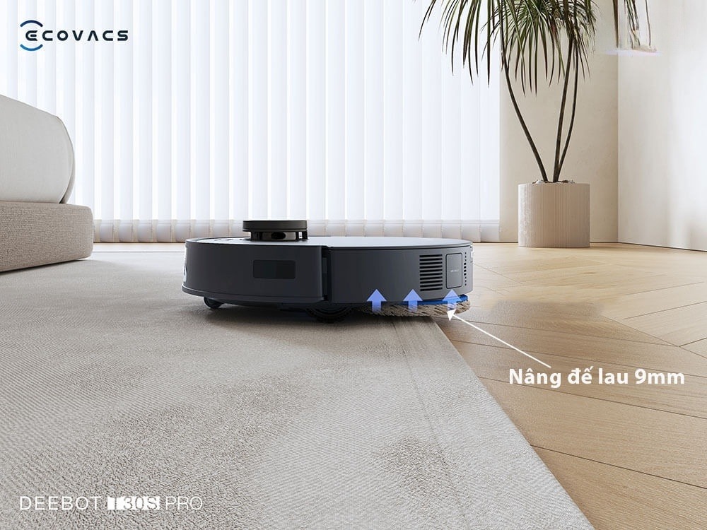 Deebot T30S Pro 2025 được trang bị cảm biến thảm siêu âm có khả năng nhận diện được thảm trải sàn với độ chính xác cao. Trong quá trình lau nhà, khi robot phát hiện ra thảm nó sẽ tự động nâng đế lau lên 9mm để không làm ướt, xước bề mặt thảm, đồng thời sẽ tự động tăng lực hút lên mức tối đa để hút sạch bụi bẩn bám dính sâu trên thảm.