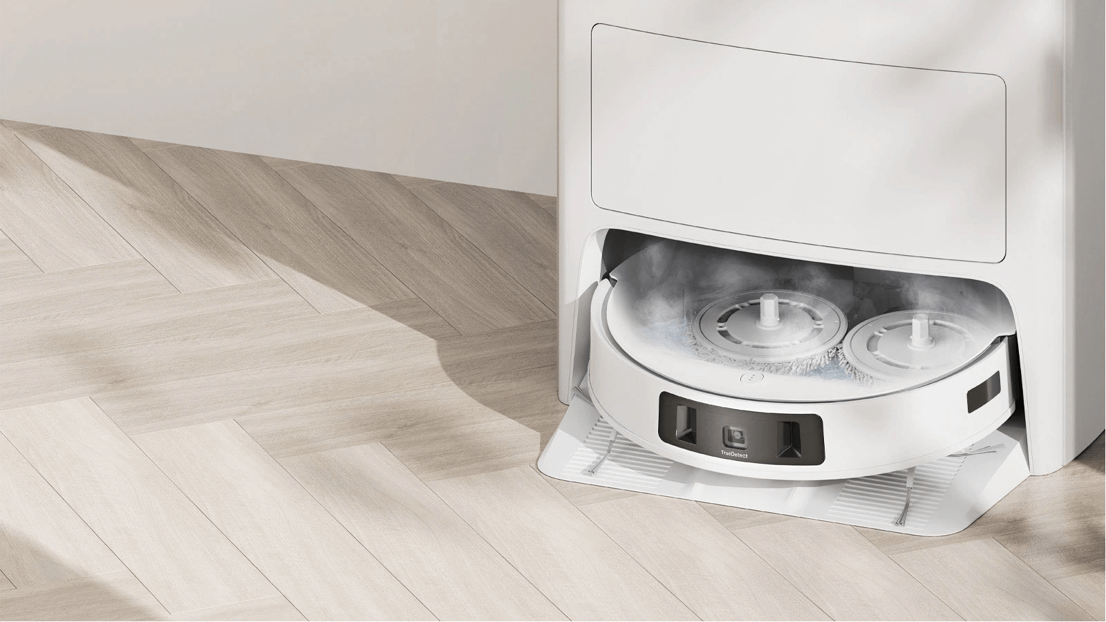 Với nhiệt độ nước 55℃, ECOVACS giặt tấm lau ngay trong trạm Omni, không cần tháo rời. Việc này giúp loại bỏ bụi bẩn cứng đầu, mùi khó chịu và nâng cao hiệu quả của dung dịch lau sàn, mang lại sự sạch sẽ tối ưu.