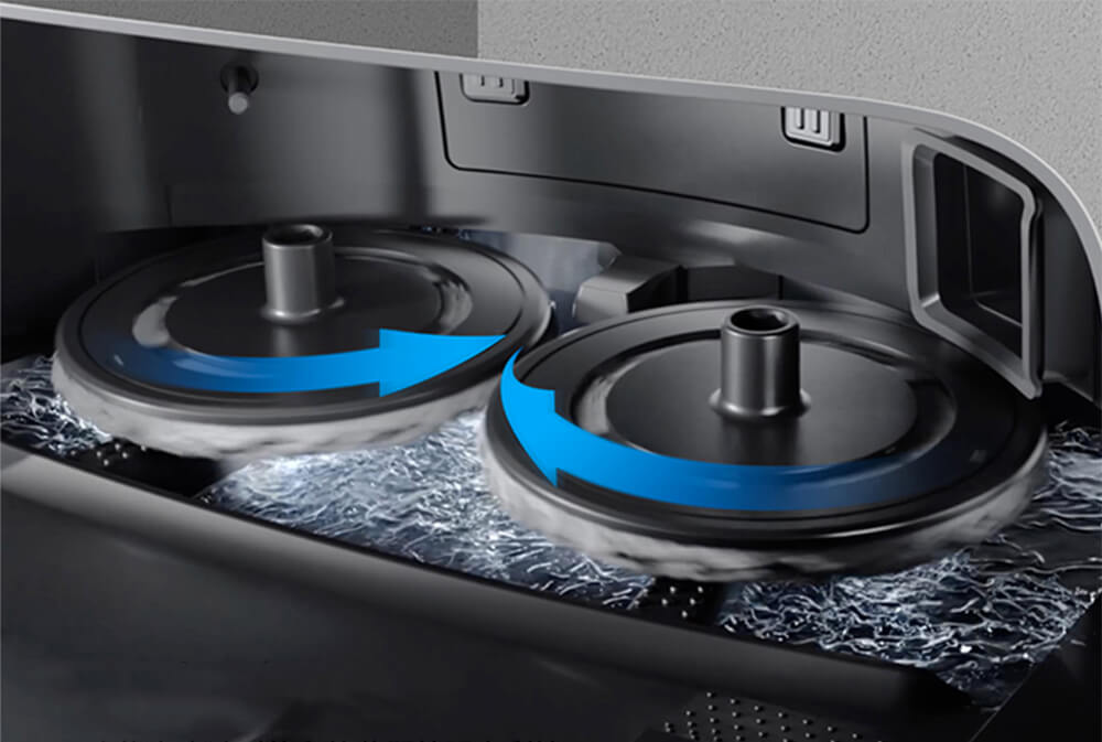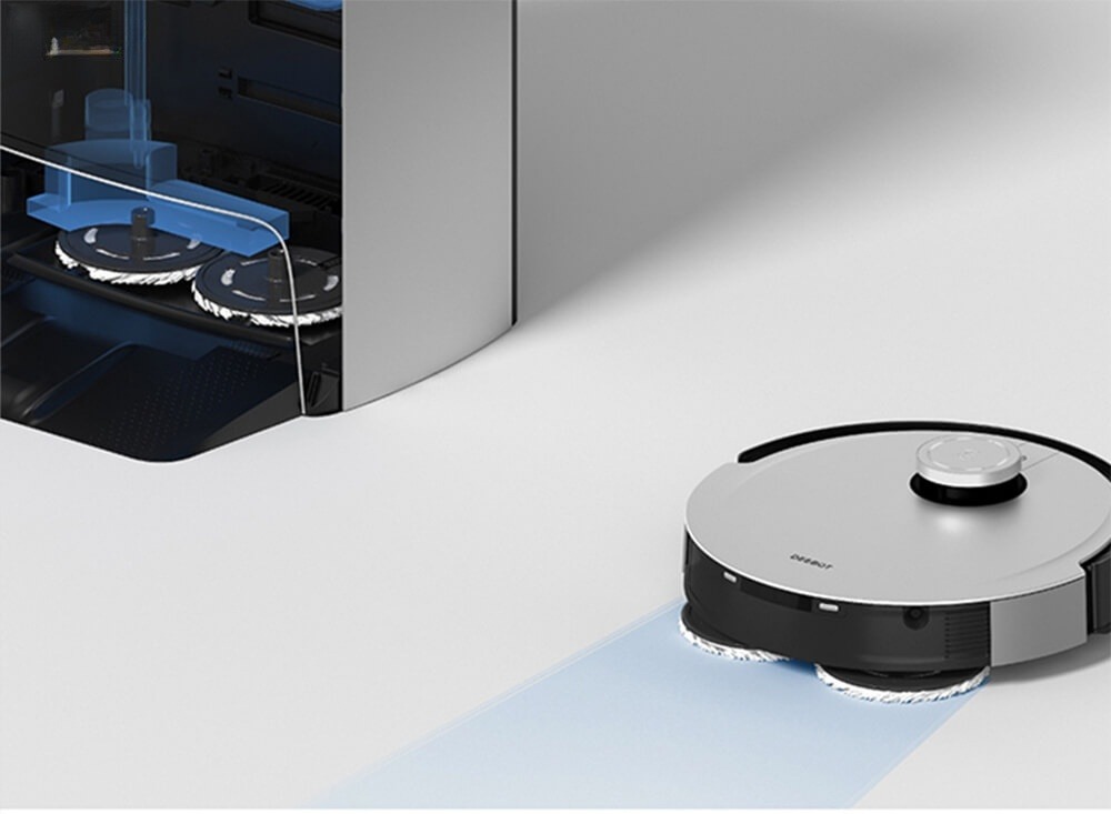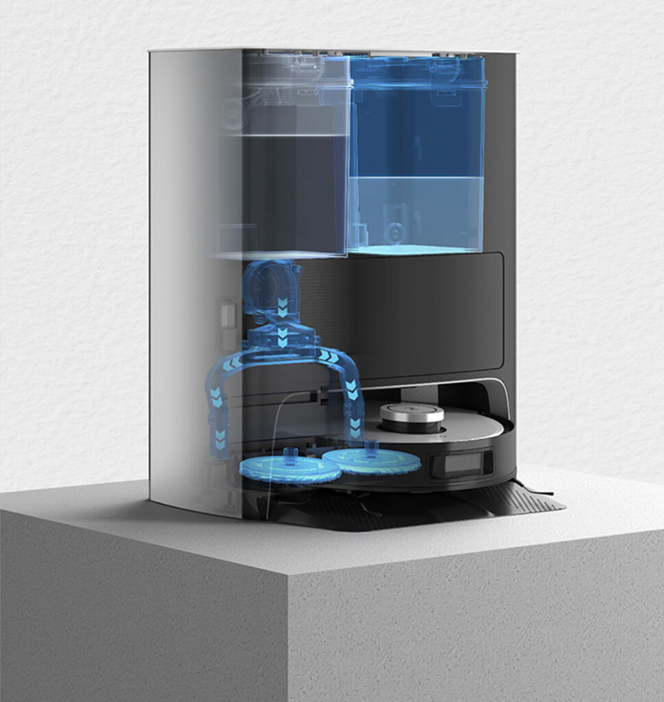 - Tự động bổ sung nước và làm khô cây lau : Trạm sạc tự động bổ sung nước và làm khô cây lau bằng không khí nóng, ngăn chặn mùi khó chịu và vi khuẩn phát triển. Tự động bổ sung nước và lau sàn với độ ẩm liên tục, từng bước là sạch bình chứa nước tích hợp trên thân robot và phối hợp với trạm sạc để bổ sung nước liên tục cho khay chứa nước.
