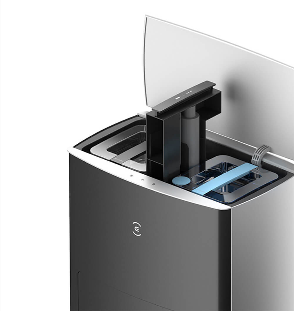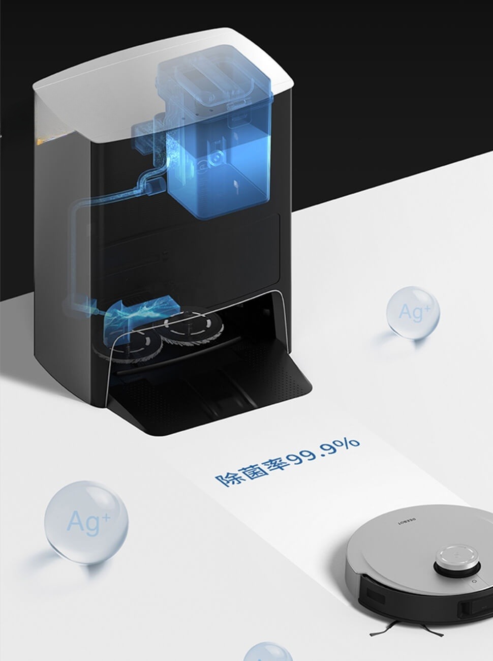 Trạm sạc tích hợp tự động giặt và sấy khô cây lau, xả bụi tự động, khử trùng bằng ion bạc Ag+, bổ sung nước tự động, và sấy khô bằng khí nóng – tất cả các bước làm sạch đều hoàn toàn tự động.