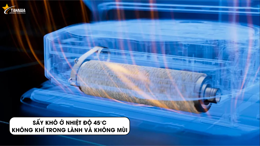 Sau khi lau dọn dẹp xong robot tự động quay về sạc, tự động đổ rác và làm sạch con lăn, xả nước bẩn trong hộp nước bẩn và tiếp thêm nước sạch vào robot hút bụi, và sấy ở nhiệt độ 45 độ C, với công nghệ sấy của TH-M23 đảm bảo con lăn khô thì cứ 10 giây con lăn được xoay một chu trình, bên cạnh đó trong quá trình sấy robot hút bụi lau nhà tự giặt giẻ Tahawa TH-M23 còn tạo ozone khử mùi hôi cho khăn.
