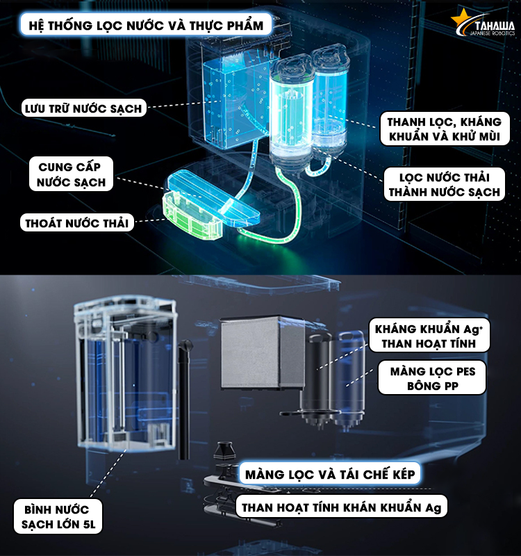 Robot hút bụi lau nhà tự giặt giẻ Tahawa TH-M23 có dung tích bình cấp nước sạch trên dock sạc lên tới 5 lít, ngoài ra trên robot cũng trang bị 1 bính chứa nước phục vụ cho việc lau nhà. Dung tích bình chứa nước này lên tới 360ml. Ngoài ra, robot cũng được trang bị bình chứa nước bẩn lên tới 250ml. Việc cấp nước sạch cũng như cả nước bẩn được robot hút bụi lau nhà tự giặt giẻ Tahawa TH-M23 thực hiện hoàn toàn tự động. Nhờ vậy robot không cần phải thường xuyên về trạm sạc giống như các dòng robot hút bụi tự giặt giẻ truyền thống.