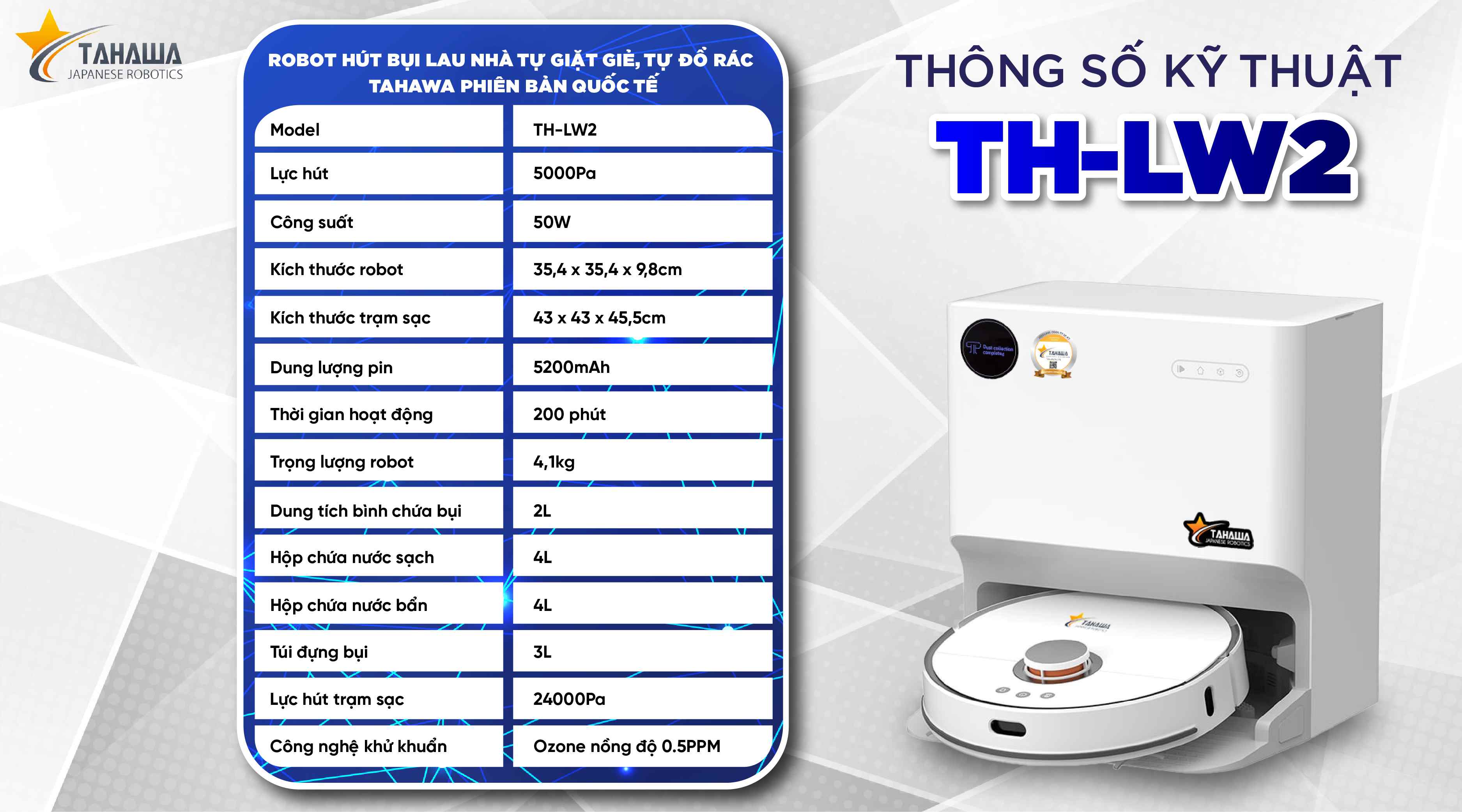 Robot Hút Bụi Lau Nhà Tự Giặt Giẻ, Tự Đổ Rác Tahawa TH-LW2 là một trong những robot hút bụi sở hữu lực hút mạnh nhất hiện nay lên tới 5000 Pa. Với lực hút đầy mạnh mẽ, TH-LW2 có thể dễ dàng hút sạch các loại bụi bẩn, lông tóc, vụn thức ăn… trên bề mặt sàn. Không chỉ vậy, các loại bụi bẩn, bụi mịn với kích thước siêu nhỏ nằm dưới các rãnh, khe của gạch lát, gỗ lát.. cũng có thể được hút sạch hoàn toàn. Nhờ vậy bạn có thể tận hưởng cuộc sống thư giãn khi TH-LW2 đã thay bạn dọn dẹp nhà cửa. Ngoài ra trong quá trình di chuyển robot cũng sẽ lau sạch sàn nhà - nơi mà nó đi qua.