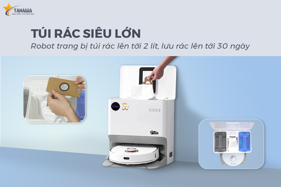 - Tính năng tự đổ rác, tự giặt giẻ, sấy giẻ thông minh
