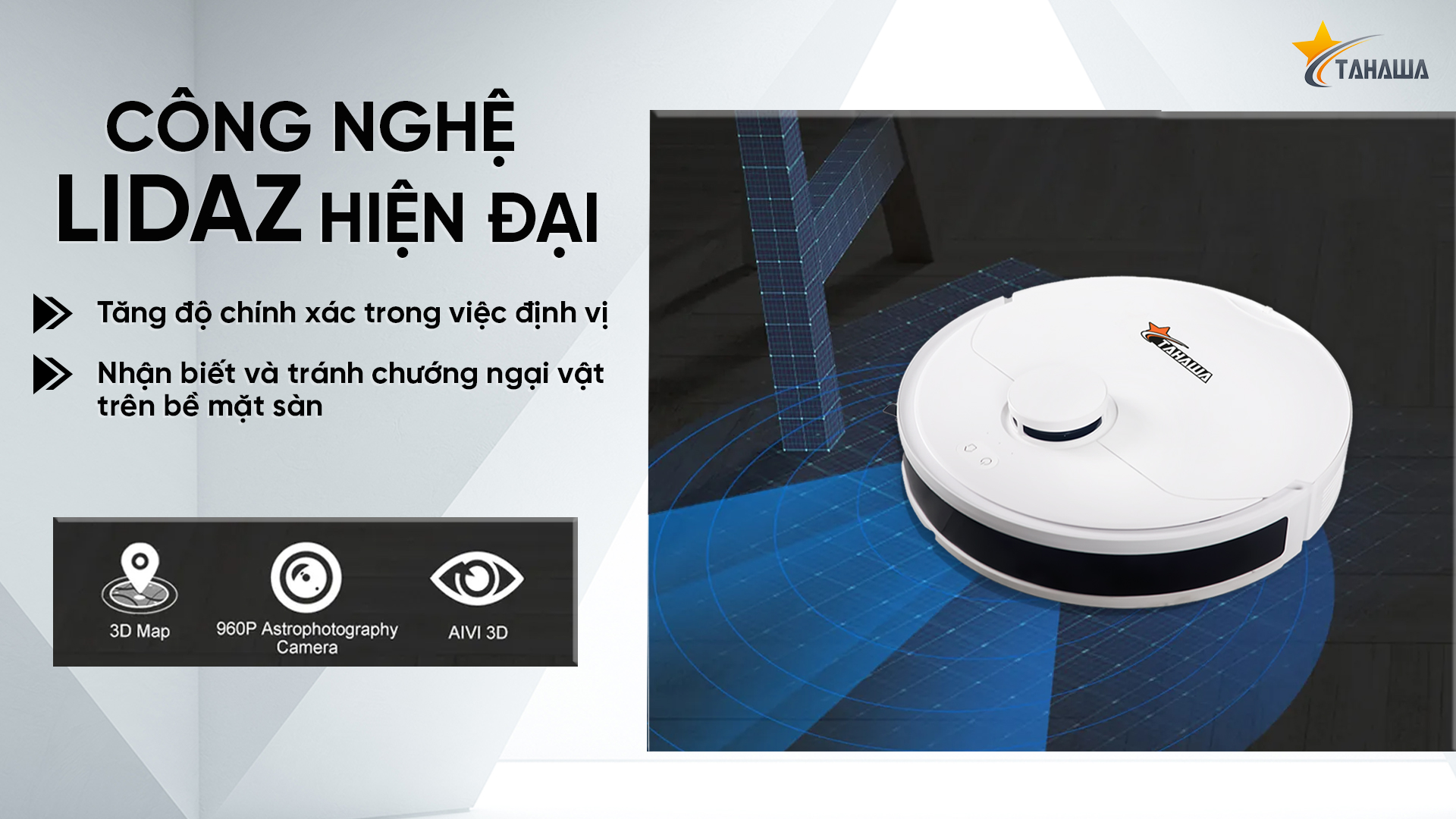 LDS LiDar - Hệ thống điều hướng nhạy bén trên robot hút bụi lau nhà Tahawa TH-L12. Robot hút bụi lau nhà L12 sử dụng công nghệ Lidar LDS chủ đạo hiện nay, định vị bằng SLAM để di chuyển nhanh chóng, mượt mà đến khu vực cần dọn dẹp. Lidar LDS sẽ xoay và quét liên tục với khoảng cách 8m để liên tục tính toán, đo lường giá trị bằng thuật toán tam giác giữa vật thể và đường cơ sở. Sau đó thông qua thuật toán Slam, robot hút bụi Tahawa TH-L12 sẽ lập bản đồ phòng và tính toán tối ưu nhất tuyến đường dọn dẹp.