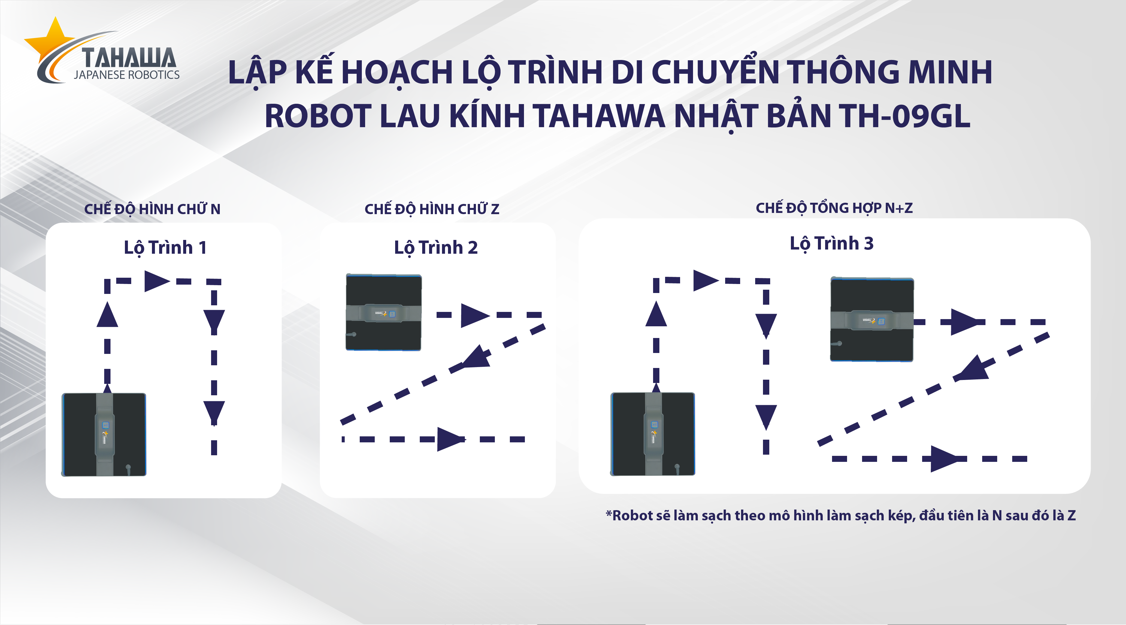 Robot lau kính Tahawa TH-09GL có thể tự lập kế hoạch lộ trình làm sạch thông minh. Với 3 chế độ di chuyển làm sạch thông minh khác nhau, robot sẽ giúp làm sạch tấm kính nhà tùy theo nhu cầu của khách hàng: