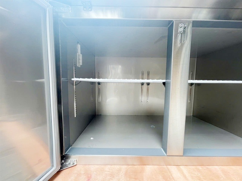Lòng tủ phẳng, không góc cạnh, được phủ lớp nhựa cao cấp giúp hạn chế bám bụi và dễ dàng lau chùi. Điều này đặc biệt quan trọng trong các môi trường bếp công nghiệp, nơi việc vệ sinh thường xuyên là yếu tố không thể thiếu để đảm bảo an toàn thực phẩm.
