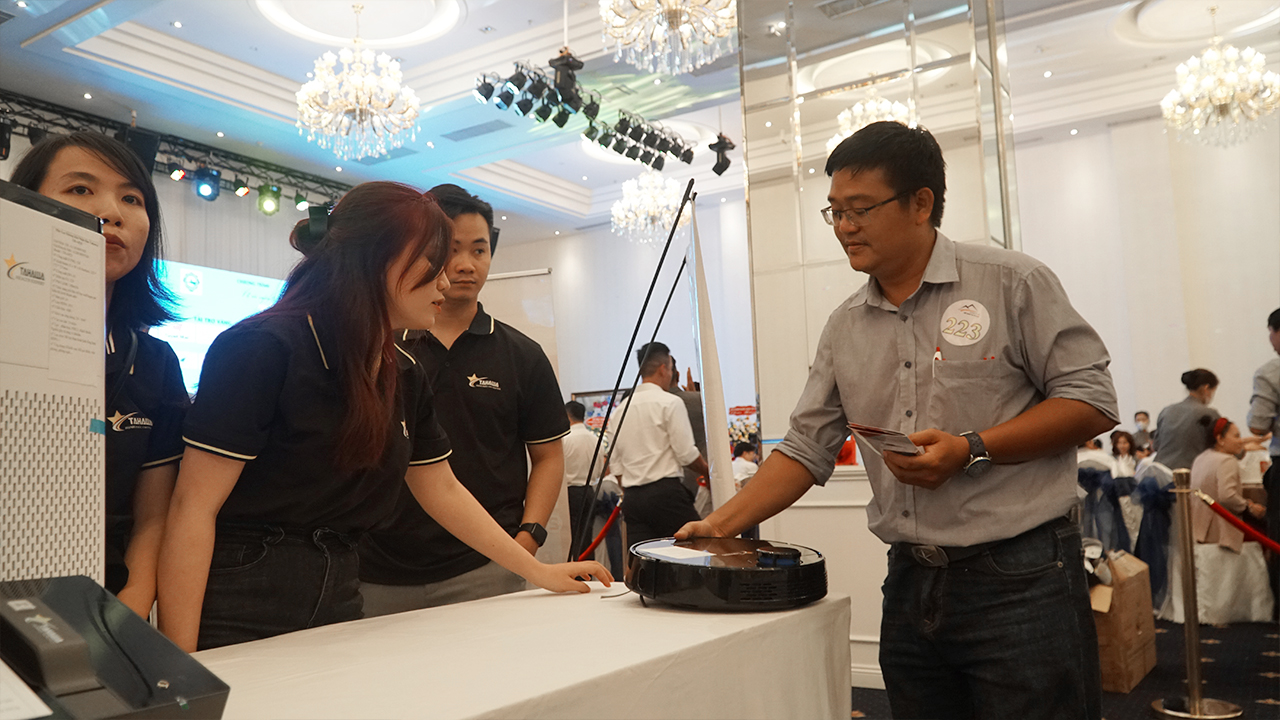 Khu gian hàng của Tahawa được trưng bày đẹp mắt, thiết kế hiện đại nhằm giới thiệu ngành hàng là thế mạnh của Tahawa gồm: robot hút bụi, robot lau kính, máy lọc không khí, gối massgae, quạt không cánh,...