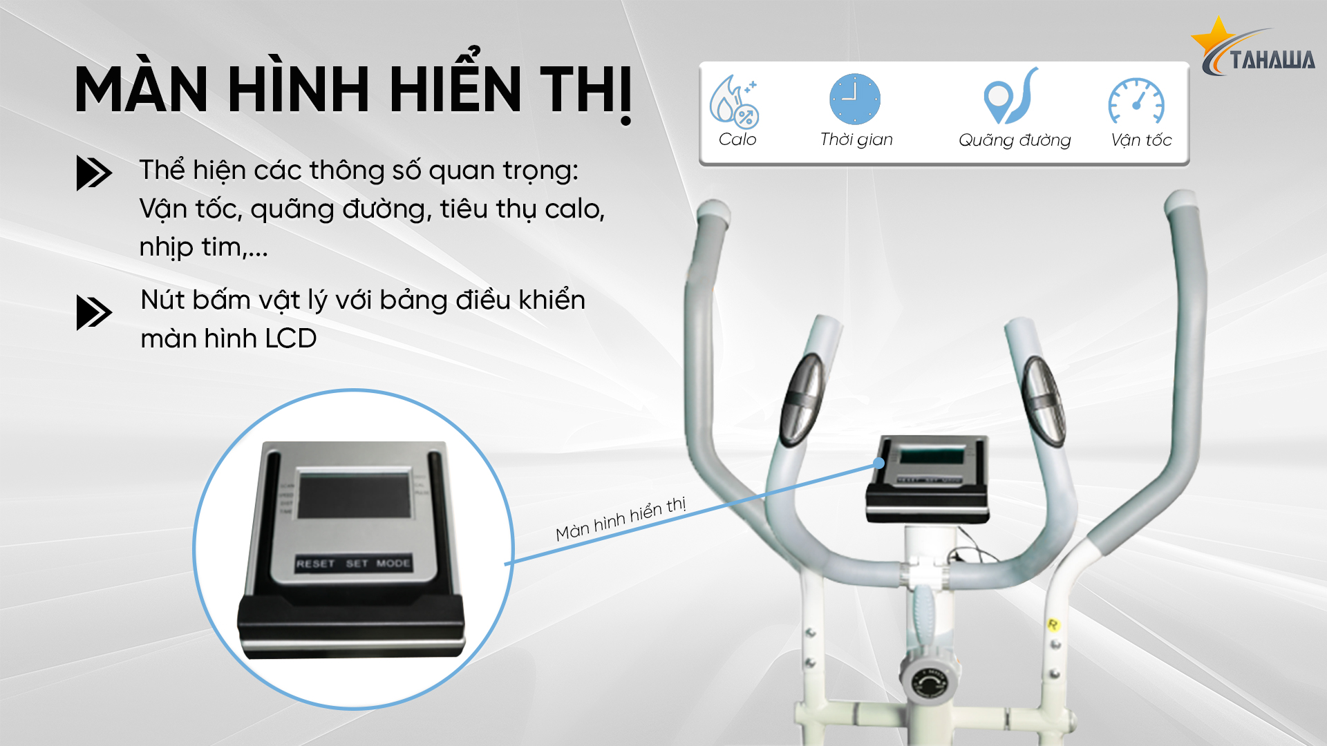 - Màn hình LCD trang bị đầy đủ các thông số tập luyện, giúp bạn đưa ra được các bài tập phù hợp với bạn thân, sớm lấy lại được vóc dáng mong muốn.